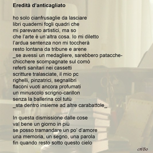 Questa voce è stata pubblicata in poesie, poesie su immagini e contrassegnata con amore, carabattole, cianfrusaglie, cielo, eredità, mondo, ombra, tempo, vita. Contrassegna il permalink.