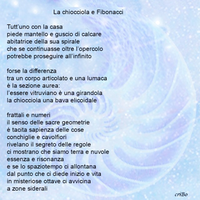 Questa voce è stata pubblicata in poesie su immagini e contrassegnata con chiocciola, Fibonacci, frattali, spirale. Contrassegna il permalink.