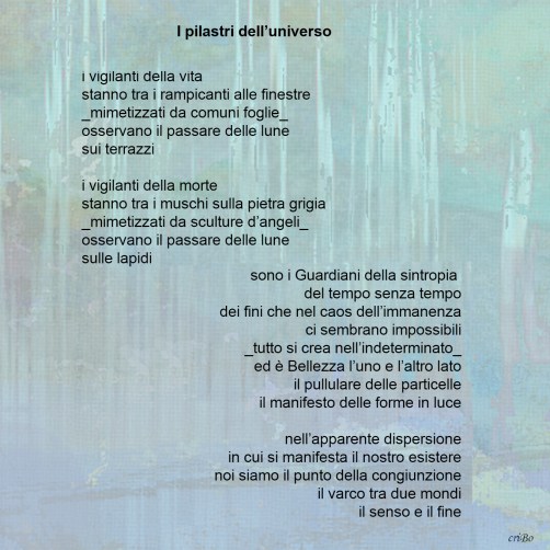 Questa voce è stata pubblicata in poesie su immagini e contrassegnata con entropia, muschi, pietra, pilastri, sintropia, universo. Contrassegna il permalink.