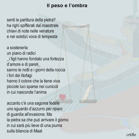 Questa voce è stata pubblicata in poesie, poesie su immagini e contrassegnata con amore, azzurro, bilancia, custode, figli, litofagi, Maat, note, pareti, pietra, piuma, solstizi. Contrassegna il permalink.
