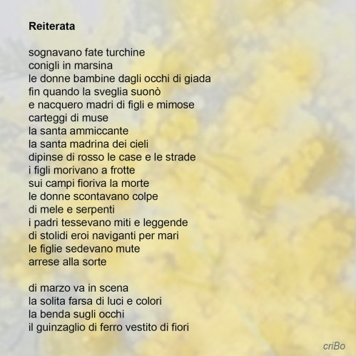 Questa voce è stata pubblicata in poesie su immagini e contrassegnata con case, cieli, conigli, eroi, fata turchina, figli, figlie, fiori, giada, guinzaglio, leggende, madri, mimosa, morte, naviganti, occhi, padri, santa, strade. Contrassegna il permalink.