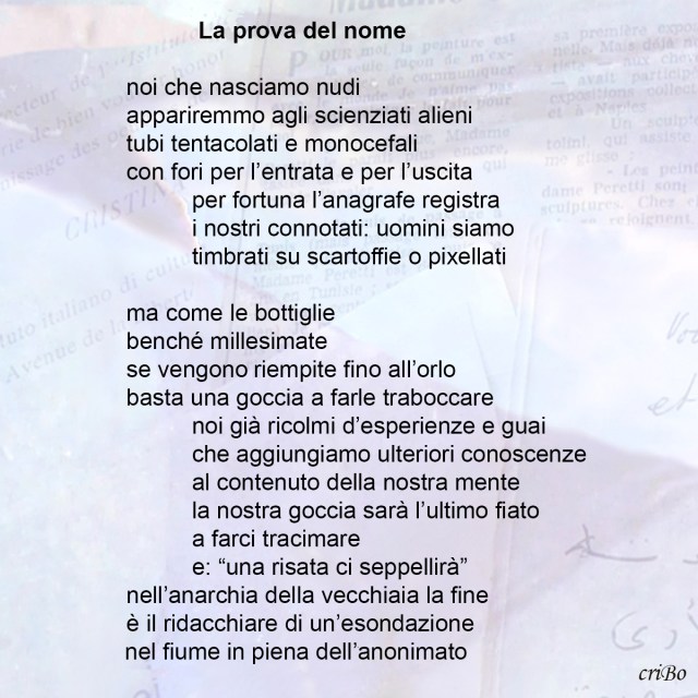 Questa voce è stata pubblicata in poesie, poesie su immagini e contrassegnata con alieni, anagrafe, anarchi, Bakunin, bottiglie, esondazione, fiume, mente, morte, pixel, scartoffie, scienziati, tempo, traboccre, tracimare, vecchiaia, vita. Contrassegna il permalink.