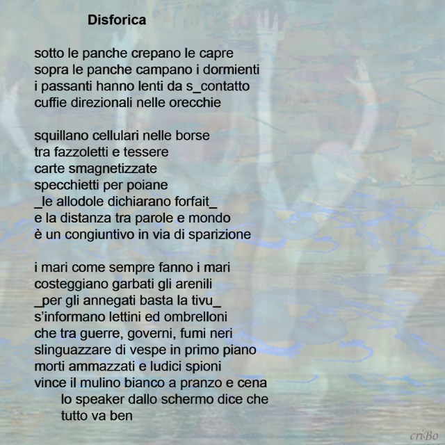Questa voce è stata pubblicata in poesie su immagini e contrassegnata con arenili, borse, capre, cellulare, congiuntivo, cuffie, disforia, lettini, mari, mondo, mulino bianco, ombrelloni, orecchie, panche, passanti, speaher, vespa. Contrassegna il permalink.