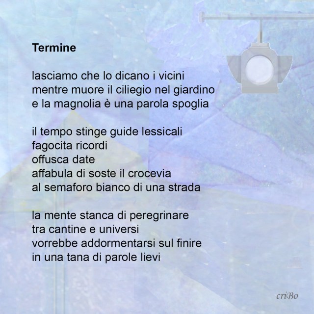 Questa voce è stata pubblicata in poesie su immagini e contrassegnata con ciliegio, crocevia, date, giardino, guide, lessico, magnolia, mente, parole, peregrinare cantina, ricordi, strada, universo, vicini. Contrassegna il permalink.
