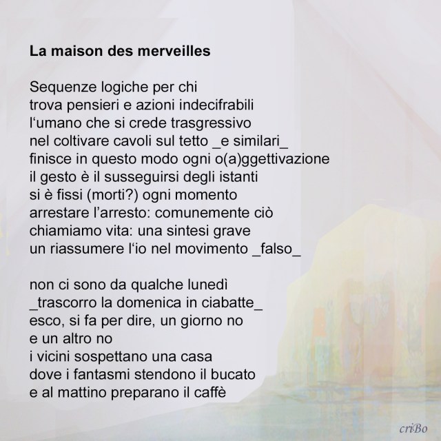 Questa voce è stata pubblicata in poesie su immagini e contrassegnata con aggettivazione, bucato, caffè, casa, gesto, lunedì ciabatte, movimento, sintesi. Contrassegna il permalink.