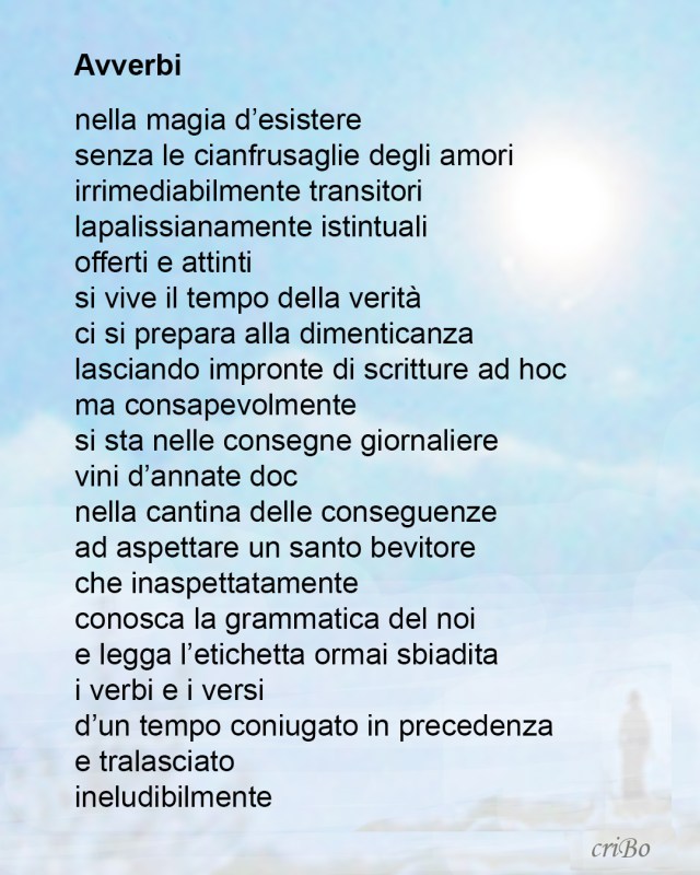 Questa voce è stata pubblicata in poesie su immagini e contrassegnata con amori, avverbi, bevitore, dimenticanza, esistere, impronte, magia, Scrittura, tempi, verità, vino d'annata. Contrassegna il permalink.