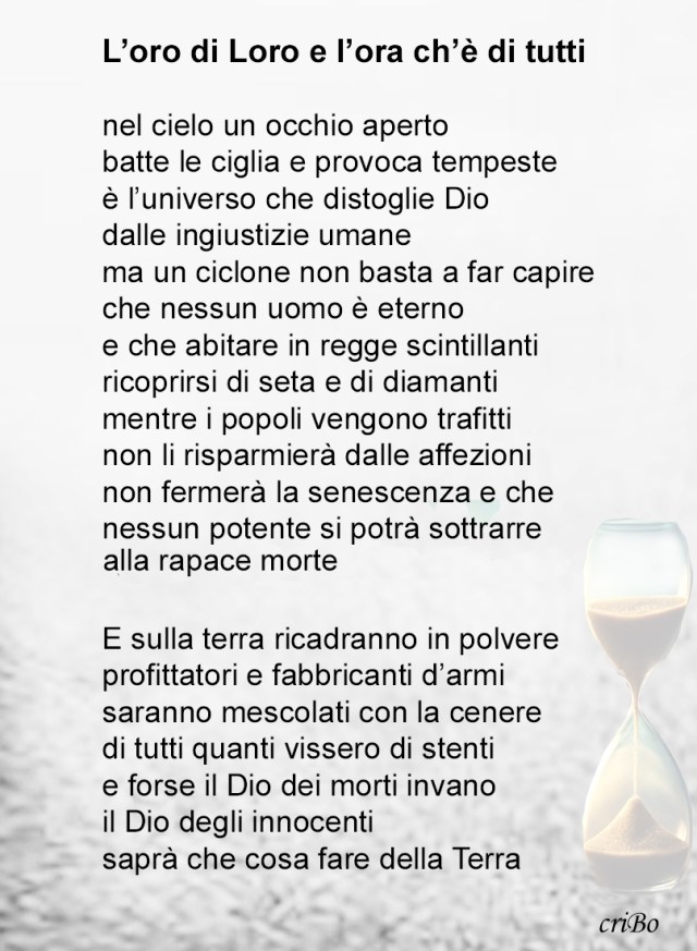 Questa voce è stata pubblicata in poesie, poesie su immagini e contrassegnata con cielo, dio, fabbricanti di morte, innocenti, morte, occhio, popoli, senescenza, stenti, tempeste, terra, uomo. Contrassegna il permalink.